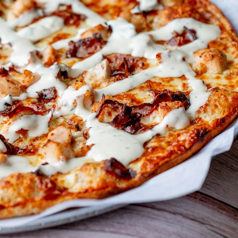 Buffalo chicken fingers, bacon, ranch and mozzarella cheese.