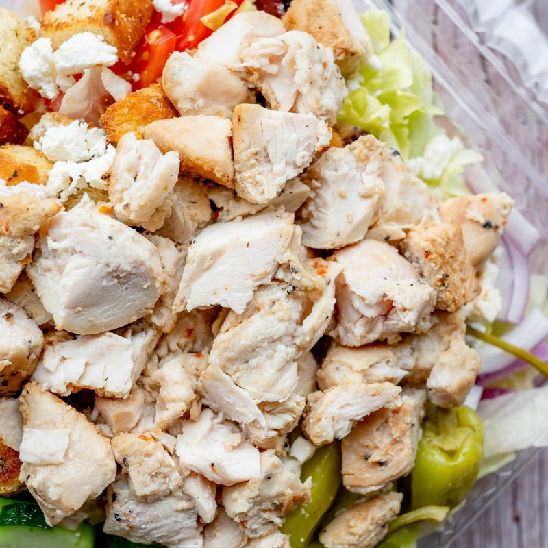 Greek salad topped with grilled house marinated chicken.