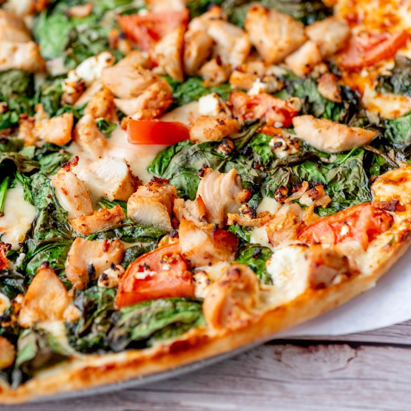 Small $18.99 | Large $23.99 • Fresh spinach, feta cheese, sliced tomatoes and chicken kabob.